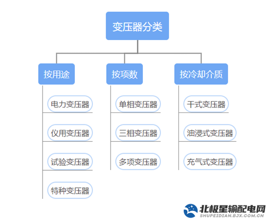 变压器按用途可分为电力变压器、仪用变压器、试验变压器和特种变压器;按相数可分为单相变压器、三相变压器和多相变压器;按冷却介质可分为干式变压器、油浸式变压器和充气式变压器。